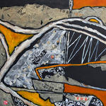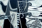 2009Kopjes, koffie-en theepotten geabstraheerd tot lijnen- en vlakkenspel. Acryl/collage op linnen. Nu te bezichtigen bij Galerie Storm, Amsterdam.