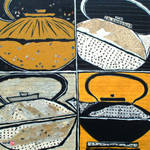 2007Theepotten op 4 verschillende manieren afgebeeld. Acryl en collage op linnen.