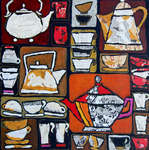 2007Kopjes en koffie-/theepotten speels neergezet met nadruk op vlakkenspel. Acryl/collage op linnen.